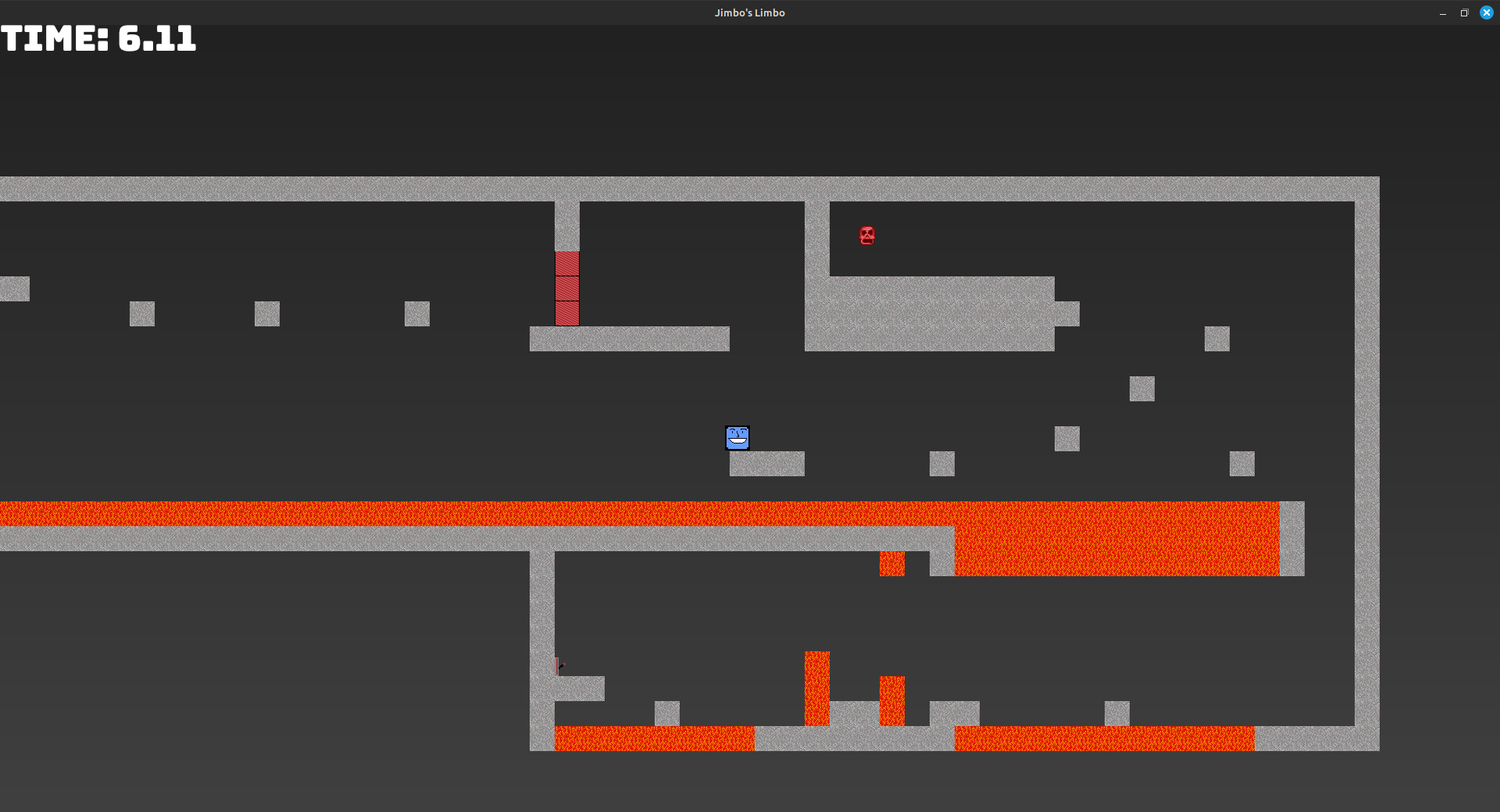 Jimbo's Limbo is a small game about Jimbo, trying to maneuver his way out of limbo by finding soul viles. Jimbo has the unique ability of being able to jump mid air which helps with the fire-y platforms of limbo. Being stuck in limbo means that, while jimbo is prepatually stuck in limbo, in death he finds his body useful as a platform to jump from as his body can be used as a standing ground for going over long lava lakes or to simply ease jumping across a boundary.